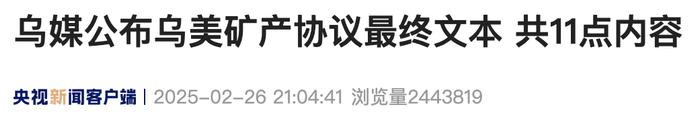 当地时间2月26日,记者获悉,乌克兰真理报在内的多家媒体发布了乌克兰和美国即将签署的矿产协议最终文本,根据乌媒体公布的文本,该协议共11点内容。